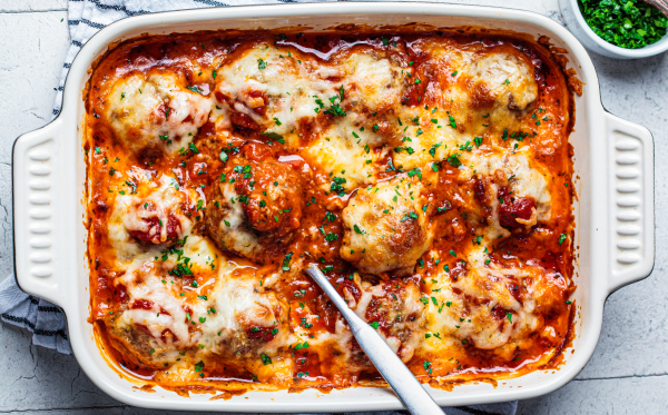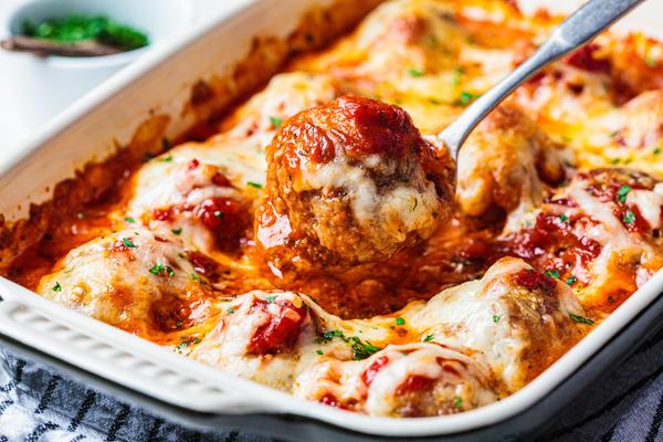 The meatballs are simmered in a savory marinara sauce, enhanced with a hint of red wine vinegar and Italian
