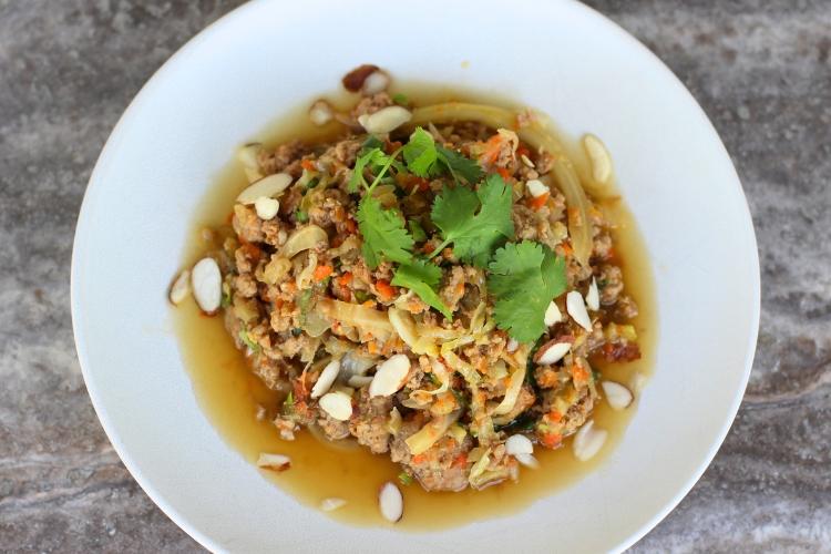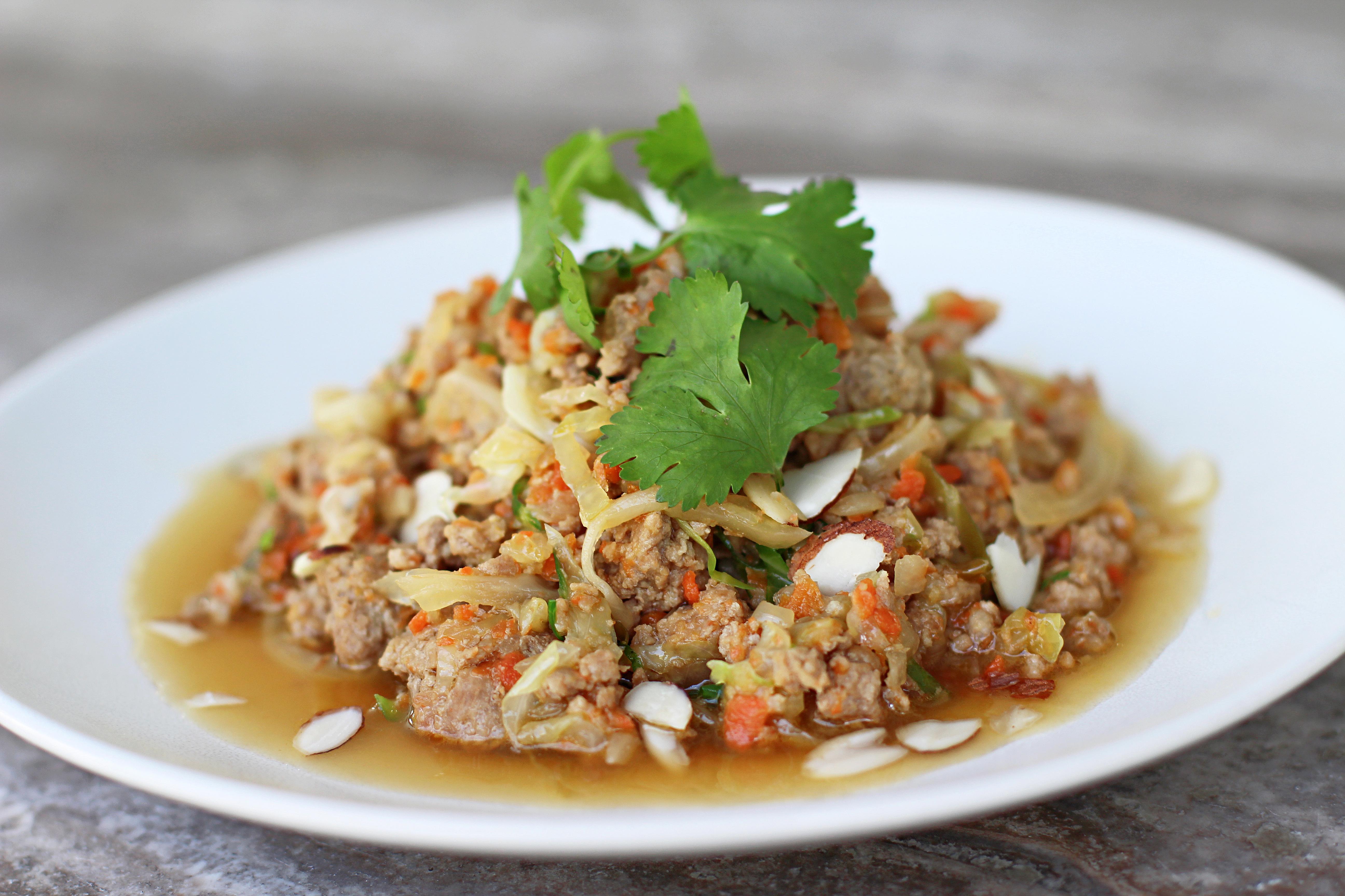 The ground pork is browned to perfection, creating a rich base that absorbs the savory notes of coconut aminos, beef broth, and toasted sesame oil.